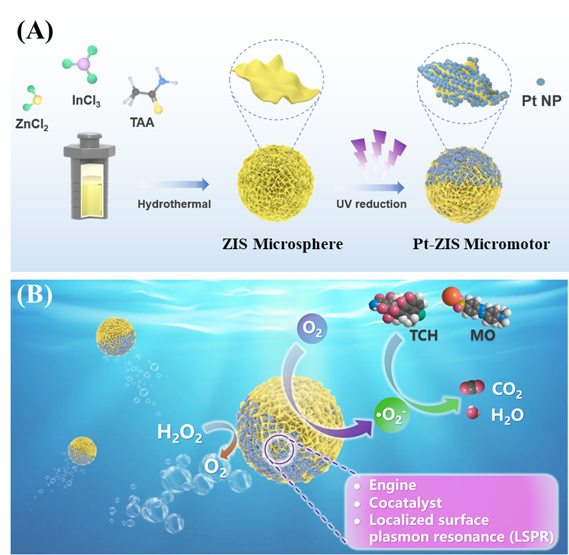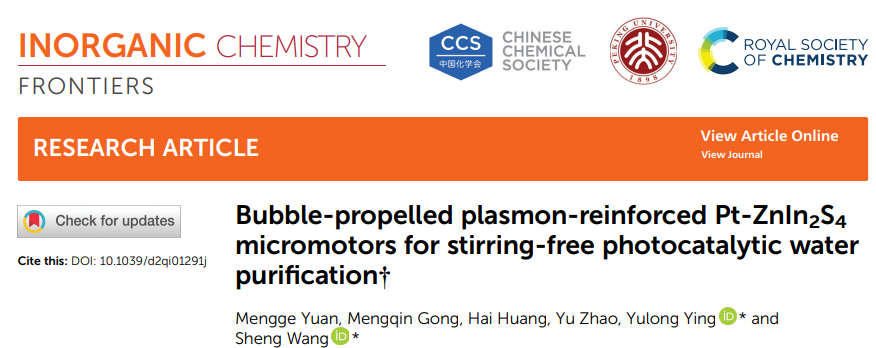环境净化与健康防护材料研究所应玉龙特聘副教授和王晟教授团队在Inorganic Chemistry Frontiers杂志上发表了题为《Bubble-Propelled Plasmon-Reinforced Pt-ZnIn2S4 Micromotors for Stirring-Free Photocatalytic Water Purification》的文章,并被该杂志选为封面文章进行宣传。该工作通过光还原法将铂纳米粒子负载于ZnIn2S4(ZIS)半导体光催化材料上,高效制备得到Pt-ZIS微纳马达,并实现了无机械搅拌模式下水体中四环素类抗生素(TCH)污染物的高效光催化降解。