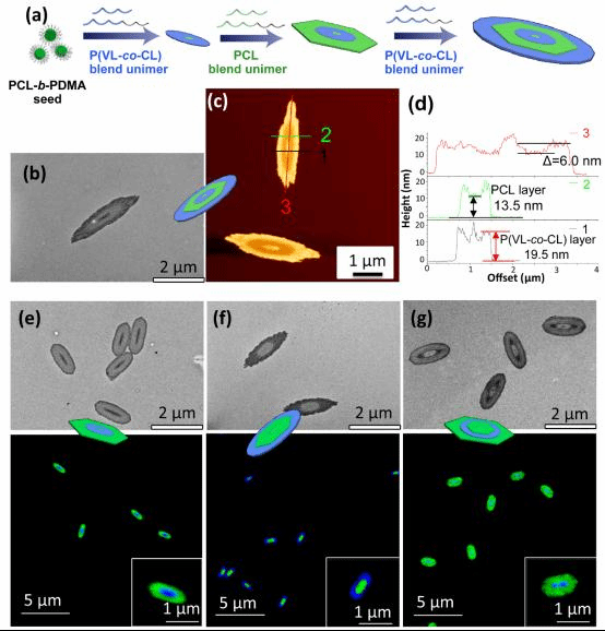 此外,结合不同聚内酯异质同晶的特点,通过开环共聚合制备了含戊内酯和己内酯组分的P(VL-co-CL)体系,共结晶的P(VL-co-CL)体系可在PCL组分的种子上进行异质附生生长,通过交替添加单聚体,即可制备结构可控的AB, BA, ABA, BAB型嵌段共胶束(图2)。