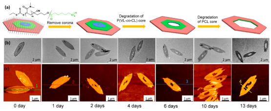 在揭示异质附生生长的机理后,研究者通过连续种子生长法精确构筑了一种ABC型三嵌段共胶束,即结晶核含有共聚组分的P(VL-co-CL), PCL和PHL,并研究了该ABC型胶束在碱性水溶液中的降解行为。研究发现最亲水的P(VL-co-CL)区域首先发生降解,即胶束的中心区域被镂空;随着时间的延长,降解区域逐渐扩展到PCL组分区域,即中空区域扩大;而最疏水的PHL组分可较长时间保留完整的晶体(图3)。同时,通过控制共胶束的序列结构,可实现BAB型共胶束中间组分的选择性降解。这种区域选择性降解可实现时空控制的方式发生,在控制程序释放和递送领域内具有巨大的应用价值,如作为未来的治疗性载体工具,在程序化条件下可"开启"载体的独特响应式长效药物释放。