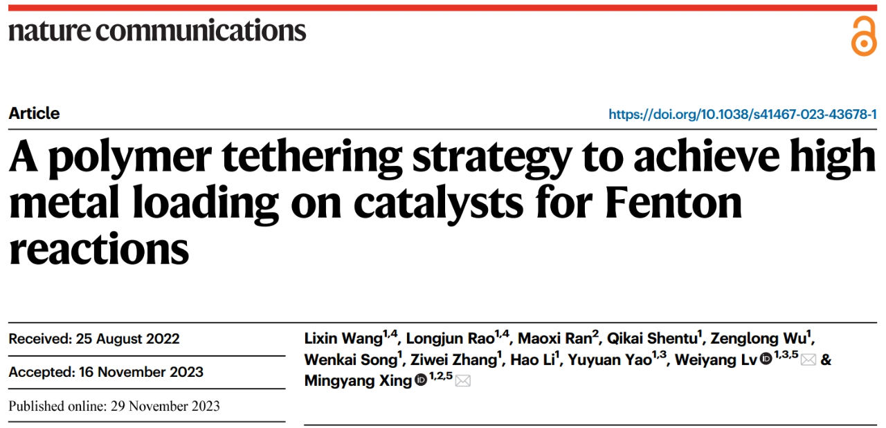 近日,我院教师吕维扬和姚玉元团队在国际权威学术期刊《自然•通讯》(Nature Communications, Nat. Commun.)上,发表了题为“A polymer tethering strategy to achieve high metal loading on catalysts for Fenton Reactions”的研究论文。我院2020级硕士研究生王李新,2017级本科生饶龙骏为论文的共同第一作者,无码a片