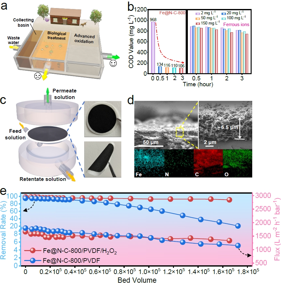 Fe@N-C/H2O2体系在处理工厂实际废水时可将废水的COD由968 mg L-1降至106 mg L-1,而传统芬顿体系无法对该复杂工业废水进行有效处理。此外,得益于Fe@N-C的二维纳米片结构、卓越的催化能力和突出的环境适应性,可将其组装成多孔催化膜用于长效处理有机废水。该流动式催化系统在处理相当于膜自身体积1.65×105倍的污水后,仍能保持超过90%的SMX去除率和1300 L m-2·h-1·bar-1的水处理通量。