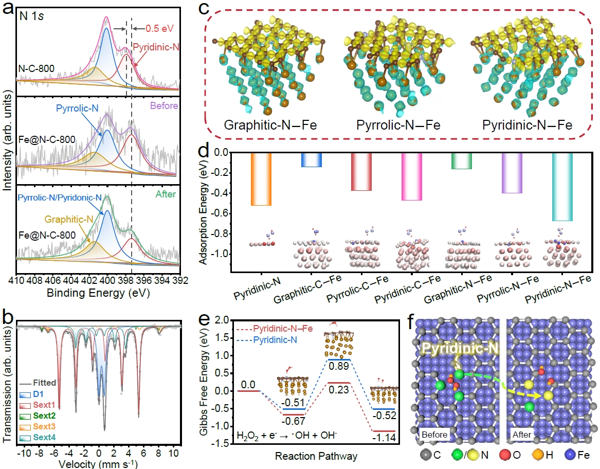 XPS分析结合密度泛函理论(DFT)计算证实,Fe核与碳层上吡啶氮位点的相互作用可提高对H2O2的吸附性能,并降低H2O2分解的反应能垒,是Fe@N-C具备优异催化性能的关键(图2)。