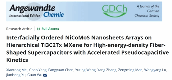 该工作从设计纤维电极的高活性有序界面、稳定界面耦合、快速界面电荷传递与反应等入手,通过微流控限域组装技术,构筑了界面有序多硫化物纳米片阵列 (NiCoMoS)-分级Ti3C2Tx MXene的先进核壳结构纤维,用于快速赝电容动力学的高能量密度超级电容器研究。该研究成果于发表在国际重要刊物《Angewandte Chemie》上 (Interfacially Ordered NiCoMoS Nanosheets Arrays on Hierarchical Ti3C2Tx MXene for High-energy-density Fiber-Shaped Supercapacitors with Accelerated Pseudocapacitive Kinetics, Angewandte Chemie International Edition 2024, e202409281)。该论文第一作者为无码a片