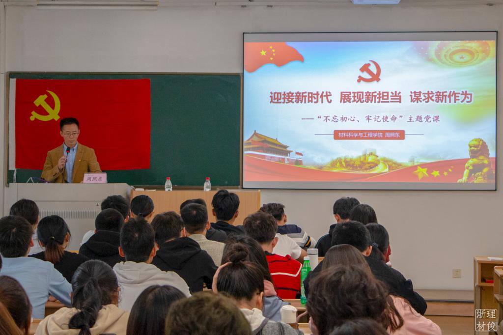 周照东老师以“迎接新时代 展现新担当 谋求新作为”为主题,通过对比国内和国外的生活环境引入课程内容,在专题党课中首先强调了“不忘初心,牢记使命”的重要性以及解释说明了初心和使命是什么。随后从“不忘初心,牢记使命”的历史溯源、基本要求、实践路径三个方面进行讲述。