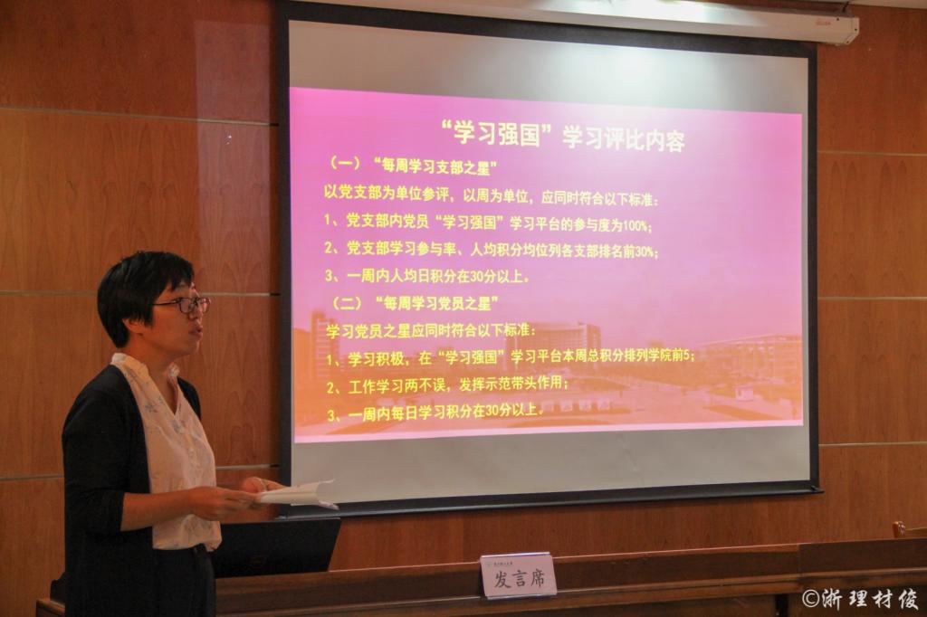 会议共三项议程。第一项,对各支部近两周学习强国学习情况进行通报,并从人均积分、人均活跃度等五个方面进行了基本排名。同时,为了激发各支部成员学习动力,学院通知将开展为期6周的学习强国学习评比活动,每周评选出“学习支部之星”、“学习党员之星”和“学习进步之星”。第二项议程,强调党支部标准化建设要求,为了使学院各党支部建设更加标准化,学院向各支部下发了《教工党支部标准化建设考评标准》和《学生党支部标准化建设考评标准》。其中,重点强调了党支部工作台账工作的标准化,确保支部每项活动和工作的开展都落地落实。