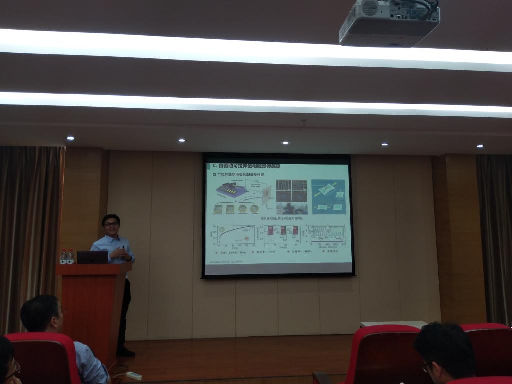 王博士首先就柔性电子传感器目前国内国际研究现状进行了介绍,同时对基于压电光子学效应的柔性阵列压力传感器、基于摩擦纳米发电机的柔性阵列压力传感器、可拉伸传感器件的设计及其应用方面总结了自己的研究成果,并且提出了未来在此领域可期的研究方向和展望。报告会后,与会师生与王博士进行了深入交流,现场气氛热烈,师生受益匪浅。