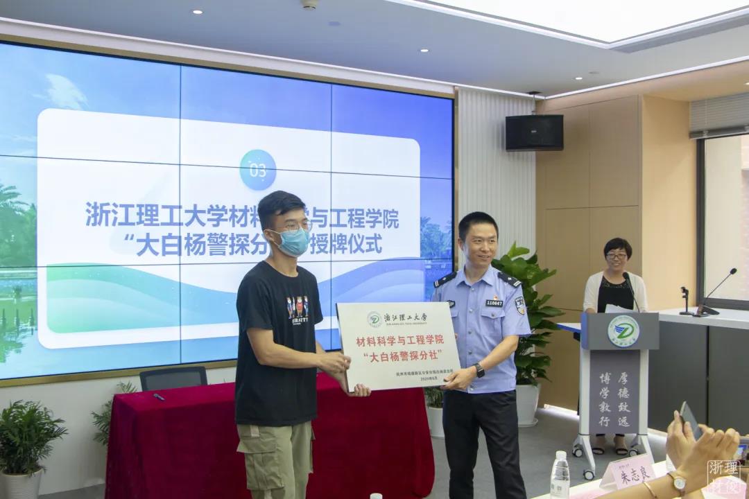“大白杨警探分社”称号,学院防诈骗宣传小分队队长林轩同学接牌。