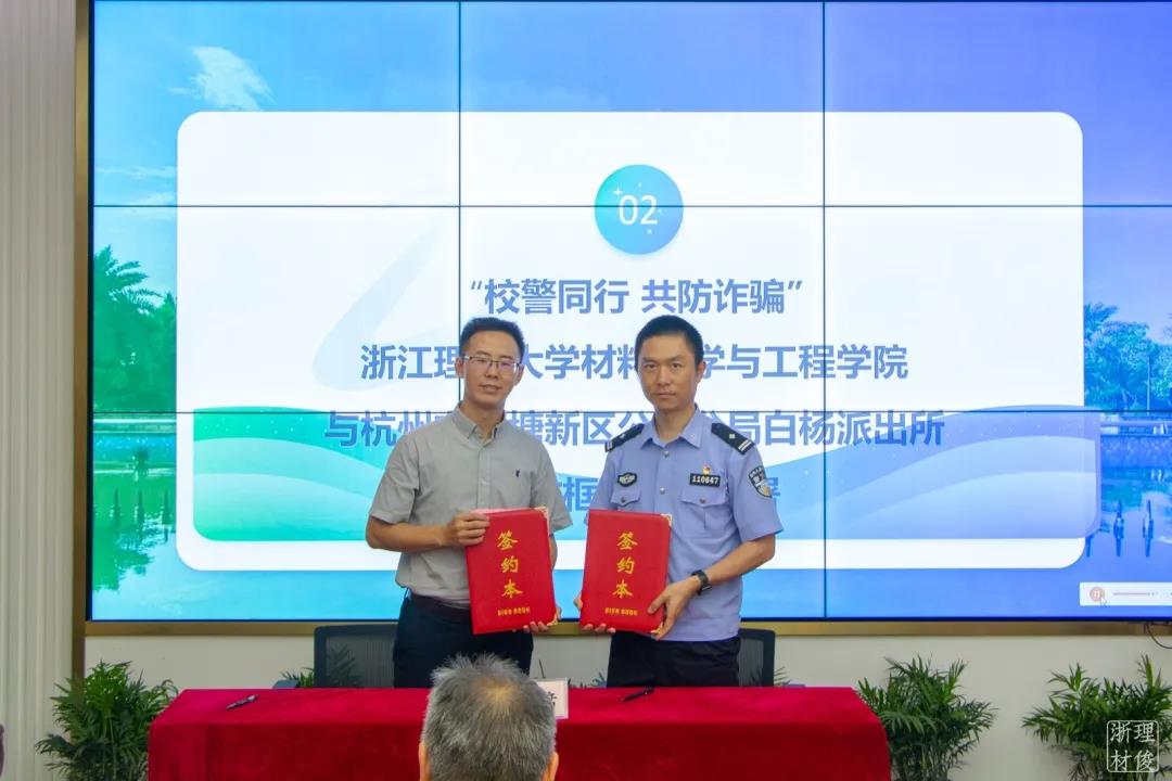 随后,学院党委委员周照东代表学院与杭州市钱塘新区公安分局白杨派出所教导员沈建平签署合作框架协议,进一步明确了校警双方在防诈骗方面的合作内容。