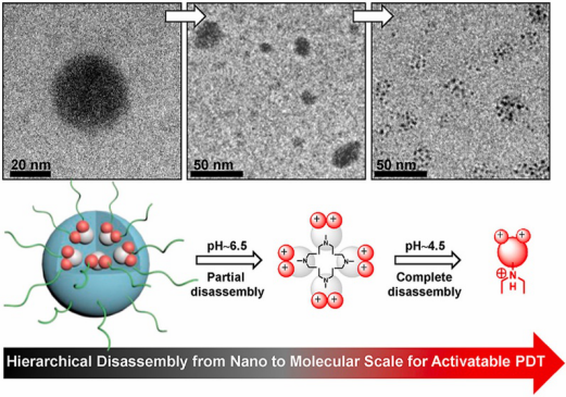光敏剂药物是肿瘤光动力治疗的核心物质,其受光激发后将三重激发态的能量转移给分子氧产生强氧化性的单线态氧,从而诱导肿瘤细胞凋亡促使肿瘤消融。然而,传统光敏剂具有低的肿瘤靶向性,产生严重的皮肤光毒副作用,导致在临床应用中受到极大的限制。为了解决这个问题,该论文提出了一种智能递送光敏剂药物的新策略,开发的光敏剂具有酸响应的从纳米至分子尺度逐级解组装特性,对推动光诊疗试剂在癌症诊断和治疗中的临床转化具有重要意义。