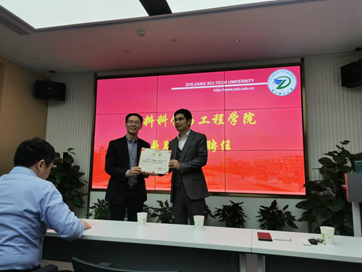 院长张先明教授为章康健博士颁发兼职教授聘任证书,学院党委副书记周照东老师为侯踊跃总经理颁发学生成长导师聘任证书。