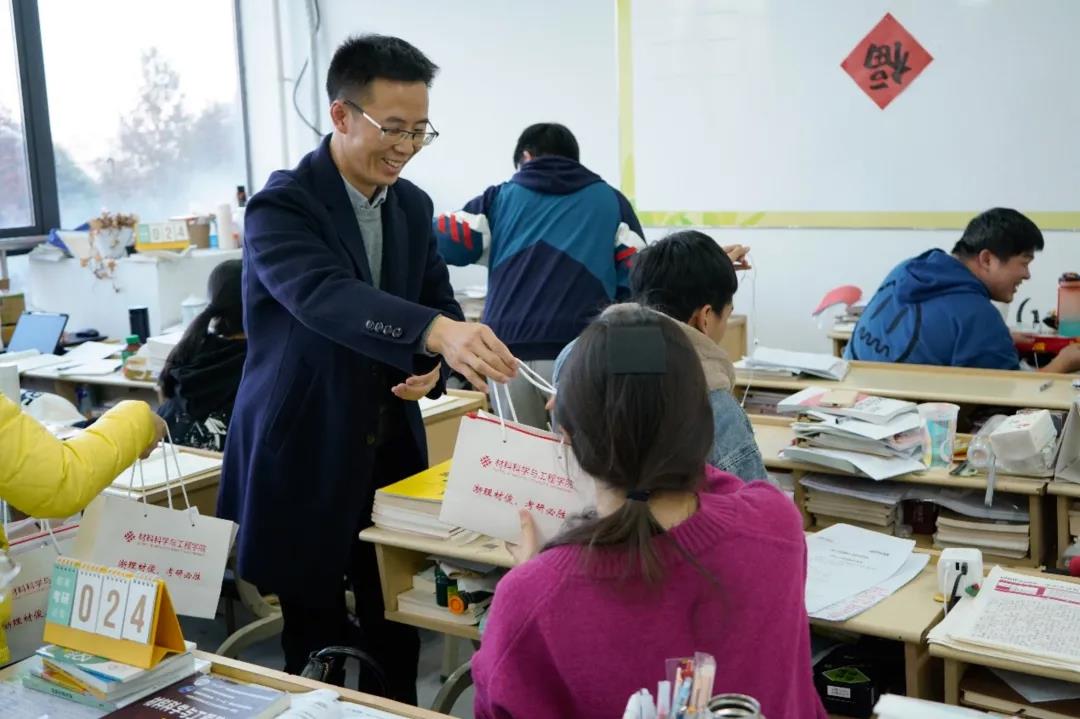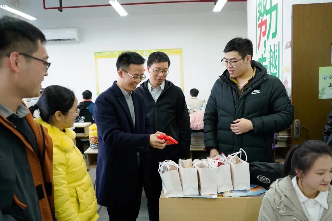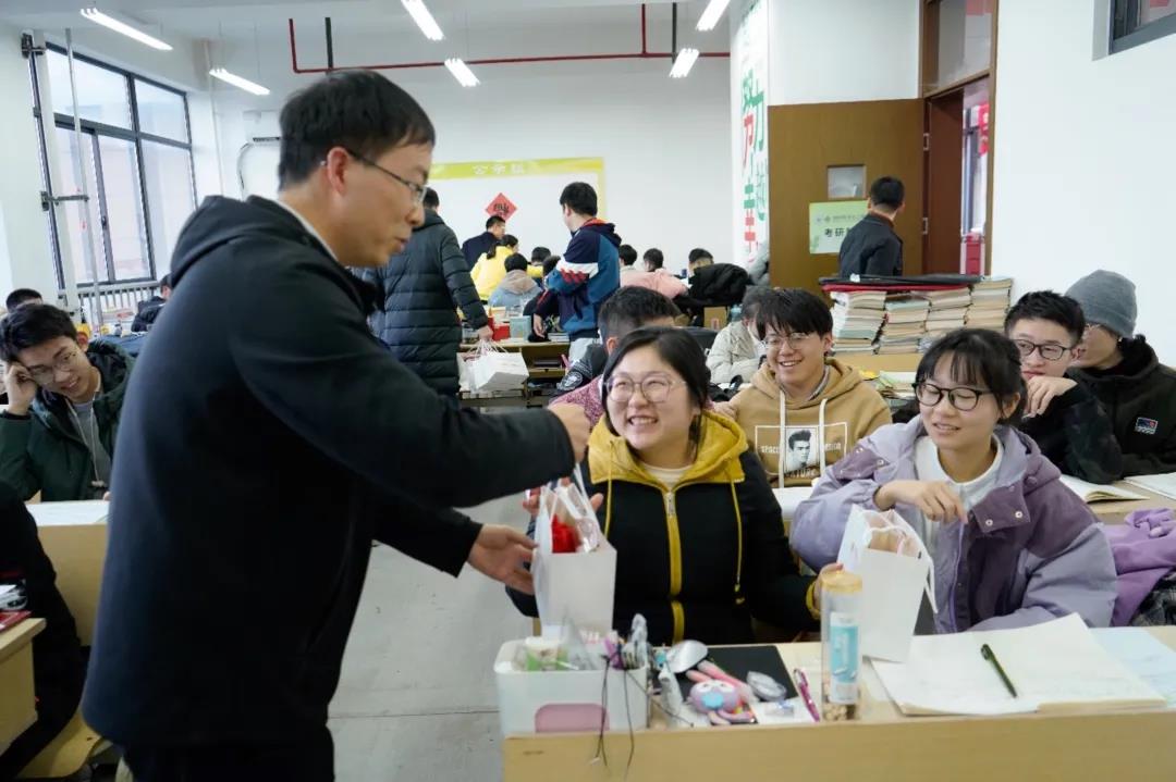 最后,考研护航特设党支部党员们与老师们一起为每一位同学送上一份暖心的礼物。一套考研文具,两枚心想事“橙”,一版“旺仔”牛奶、装有绣着“金榜题名”、“考研必过”等字样的红色袜子锦囊,以及来自学院党员同志们亲笔写下的考研须知和祝福卡片。在冬日里为奋战在考研前线的同学带去一份温暖。