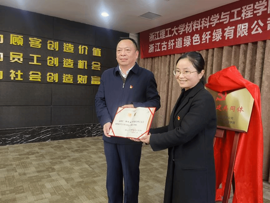 教授陈文兴与古纤道共建院士工作站正式签约启动。2021年2月,校企双方签署全面战略合作协议,学校协同公司科技创新,深化产学研合作。双方始终围绕聚酯产业链关键共性问题研发,新产品研发、聚酯材料前沿技术等课题开展全方位合作,共同创新引领行业发展。本次党建共同体共建,将进一步以党建为引领,共同推进人才培养、产学研合作的深入开展。