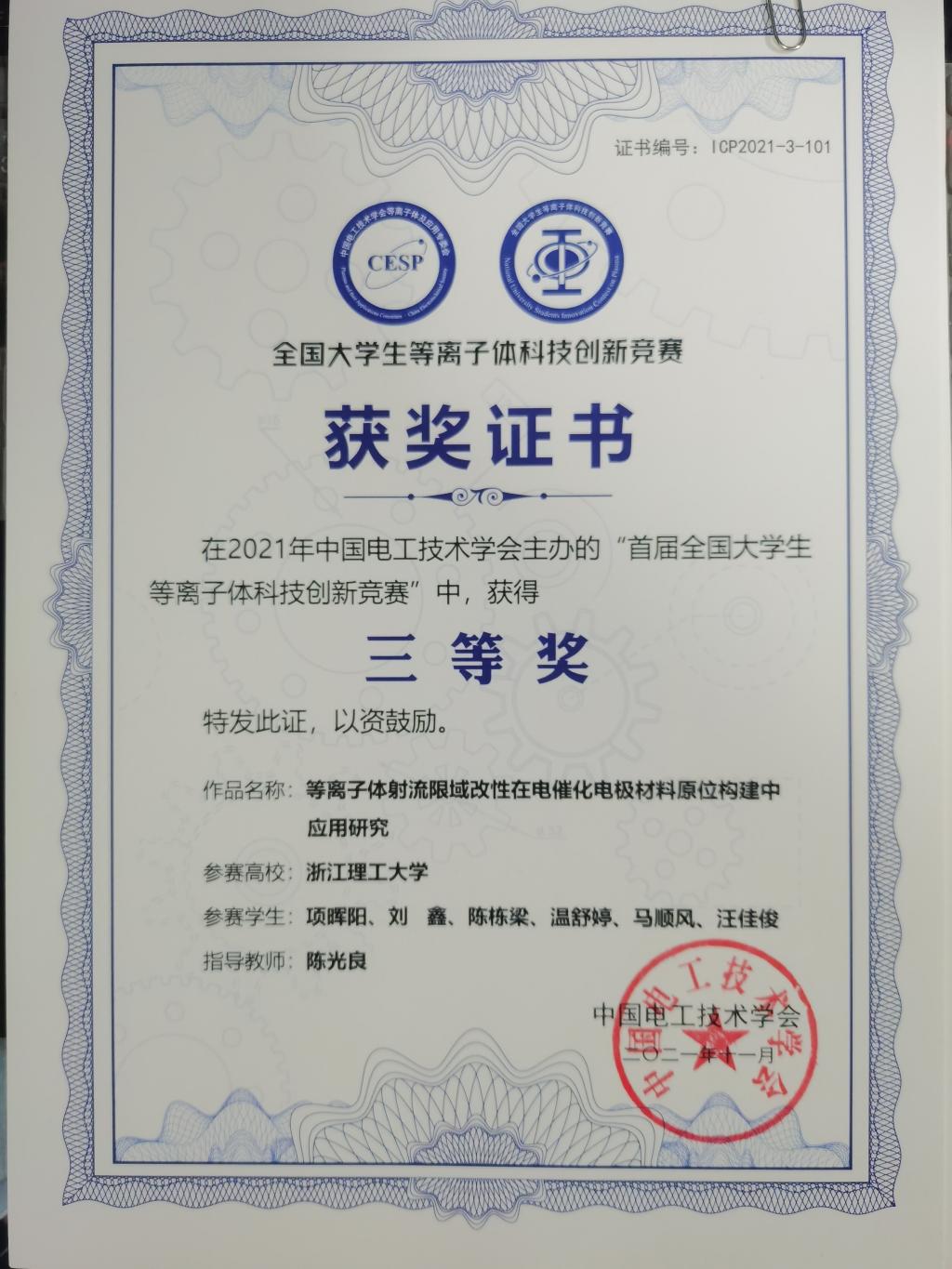 经过专家独立评审及竞赛组委会讨论通过158件作品入围决赛,其中我校入选4件作品。决赛采用线上线下结合的方式进行,参赛者线上答辩、专家线下集中评审。经过连续11个小时紧张有序的闭门分组答辩,决赛于11月27日20时30分正式落下帷幕。我院陈光良老师指导的研究生团队作品《等离子体射流限域改性在电催化电极材料原位构建中应用研究》获得三等奖。