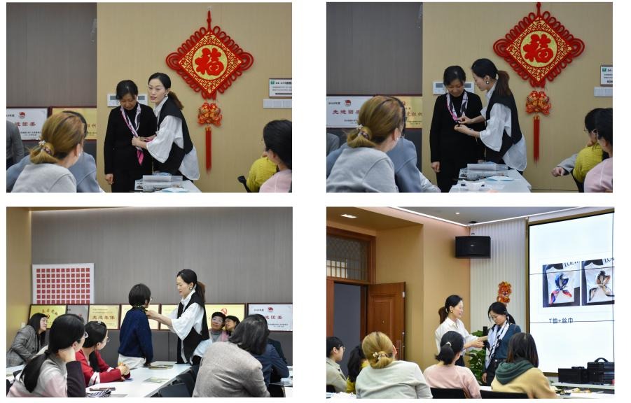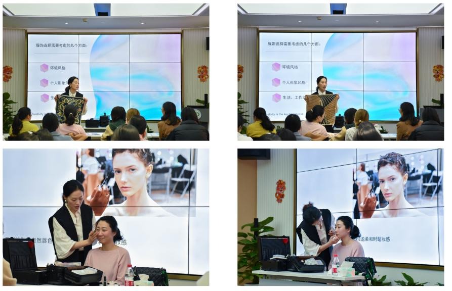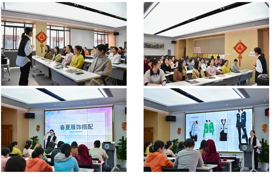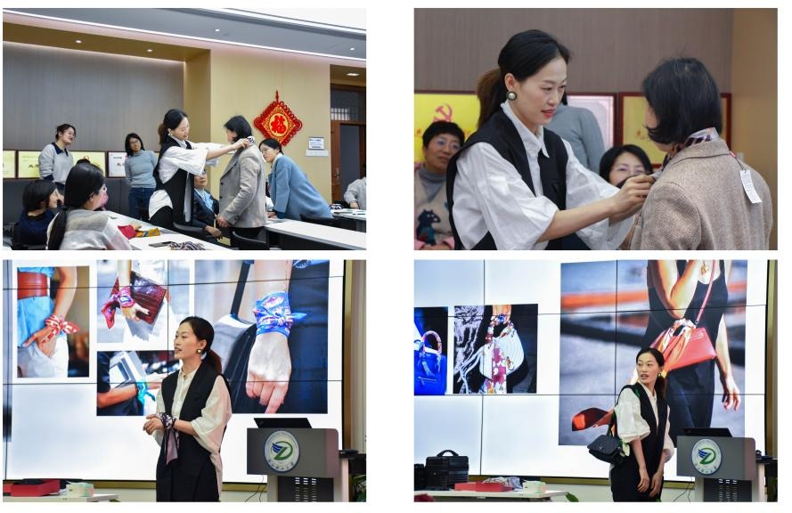 活动特别邀请了服装学院人物形象设计专业的元晓敏老师到场讲授。元老师从春夏服装搭配、丝巾系法与服装搭配、2022彩妆流行趋势三个方面展开了讲解,并根据现场老师的不同衣着、不同脸型、不同肤色等教大家春夏服装与丝巾的搭配和基础彩妆的手法与技巧。活动主题突出、实用性强,讲解深入浅出、生动形象,学院老师们积极参加、乐在其中。