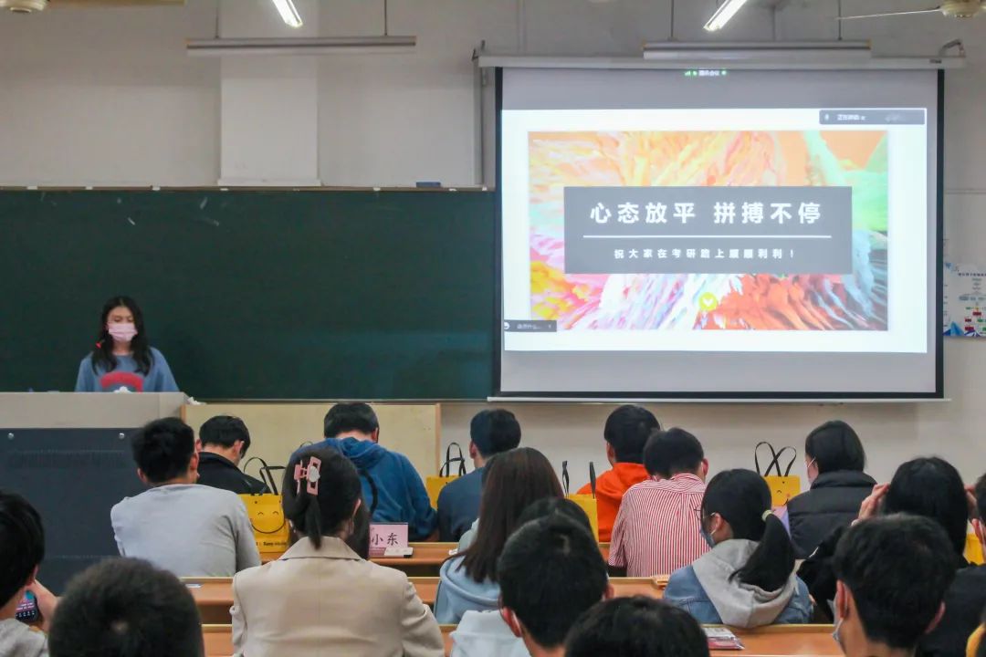 三是有关爱,有保障:学院围绕考研在不同环节为大家保驾护航,前期、中期、后期老师们会一直陪伴,考研是一场持久战,希望同学们保持好心态,战胜困难。