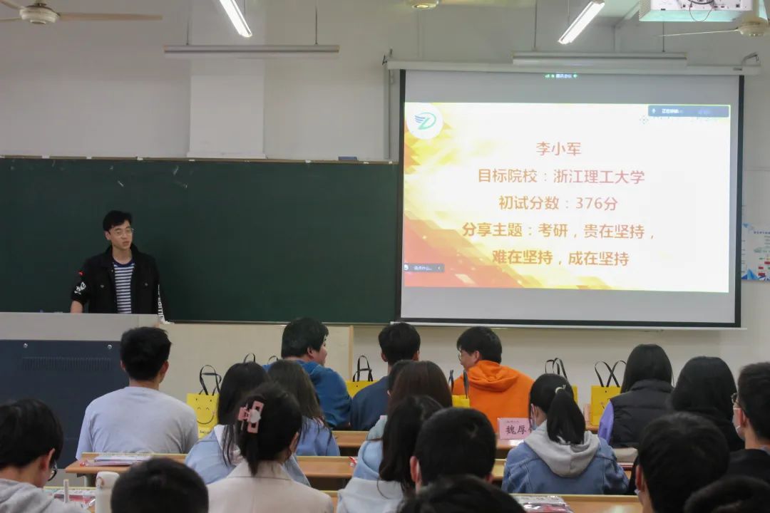 的李小军重点讲述了本专业考研与跨专业考研的区别,跨考难度大,定下目标后他从择校、复习安排以及个人日常安排上给大家建议,考研贵在坚持,难在坚持,成在坚持,鼓励大家笑到最后。