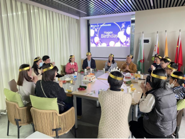 生日会上,寿星们戴上生日帽与大家一起唱生日快乐歌、切蛋糕、分享美食,开心地交流工作和生活,现场一片欢声笑语,气氛温馨融洽。