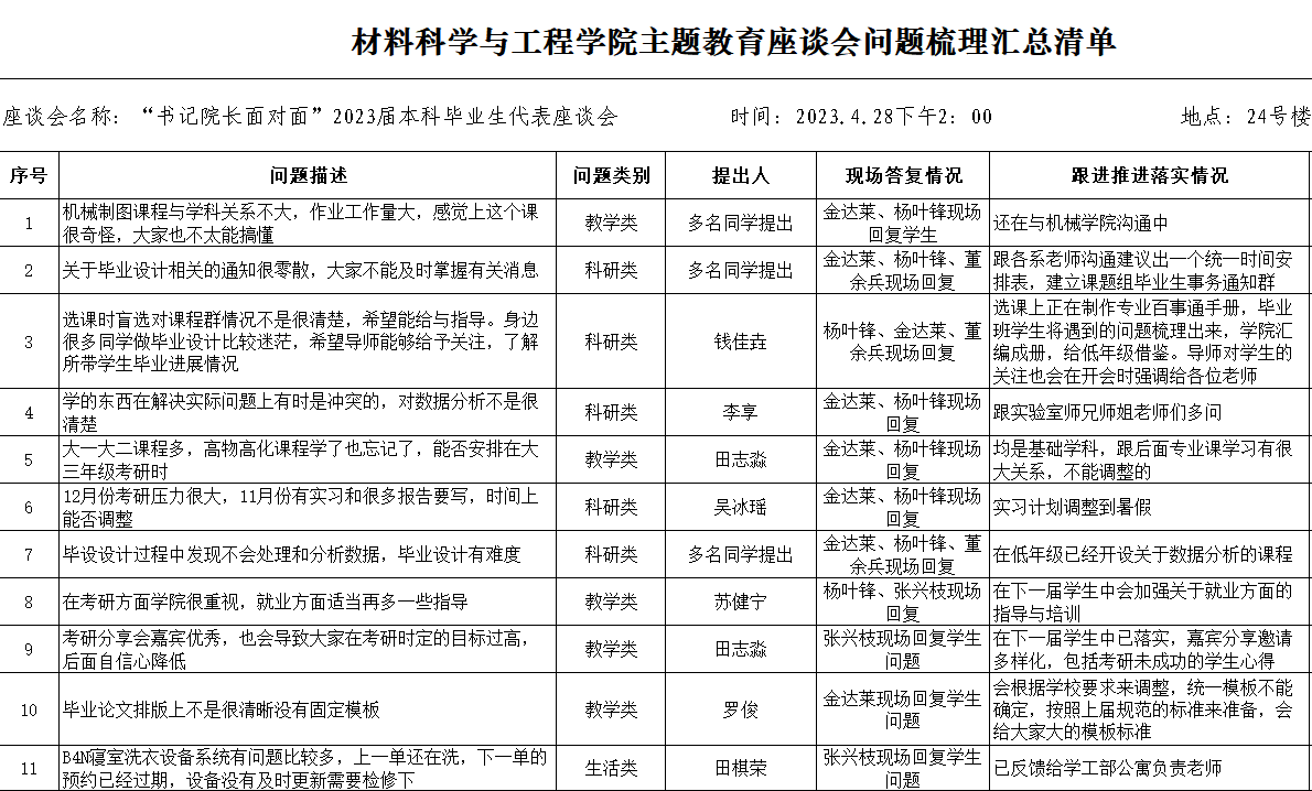 调查研究是谋事之基、成事之道。学院认真落实主题教育关于调查研究的工作要求,组织引导全体党员干部,以“一竿子插到底”的精神,用“望、闻、问、切”四诊法深入开展调研,力争做到把情况摸清、把问题找准、把对策提实。一是“望”实情。学院领导班子带头走进一线师生,拜访兄弟院校,赴各地合作企业、生源基地和用人单位,突出重点望“问题”、望“不足”,共走访调研各类企业、单位13家。二是“闻”民意。统筹结合“书记领航”项目、访企拓岗、社会实践等活动,学院领导干部以等多种形式,召开9场各类师生座谈会,准确了解师生群众所思所想所急所盼,提高调研结果的科学性和实效性。三是“问”良策。根据学校大兴调查研究工作方案,学院党委聚焦事业发展核心,由书记与院长分别领衔“高层次人才引育”“高质量人才培养”两大课题,依靠师生智慧破解发展难题,依靠师生力量推动事业发展。四是“切”症结。对于在调研中反映和发现的问题,逐一梳理,形成问题清单、任务清单,共收集和梳理问题67个,均已明确整改措施和期限,目前已解决52个。认真用好用活案例资源,以点带面推动整体工作实现新提升。