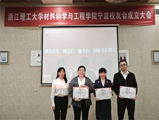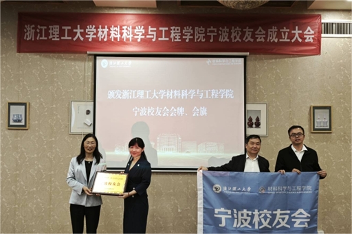 学院党委书记仰滢和院长张先明为学院宁波校友会授牌、授旗,会长欧阳申珅、秘书长邵振宗接牌、接旗。