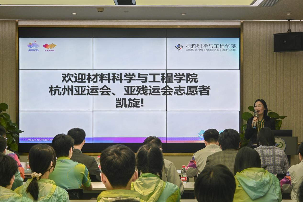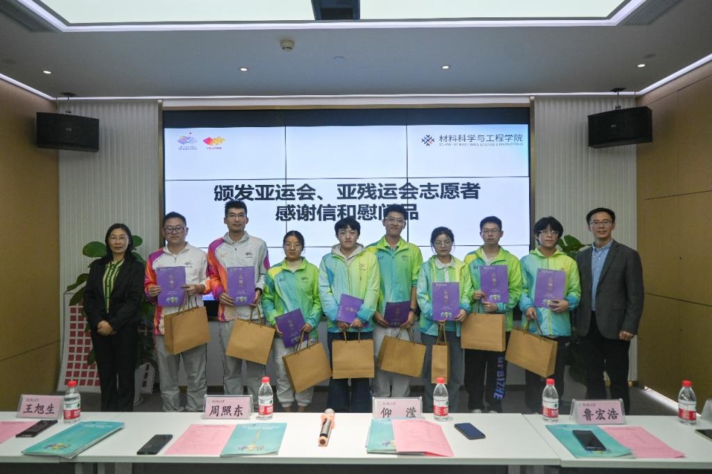 学院党委书记仰滢,学院党委副书记、纪委书记周照东,学院团委书记、学工办主任张姗姗,学院研究生材料工程第一党支部书记应玉龙,研究生材料科学与工程第二党支部书记王旭生,学院团委副书记、党建委指导老师鲁宏浩,学院学生会秘书长张兴枝,学院全媒体中心指导老师李汶泽,学院社区管理委员会指导老师高扬以及学院全体亚运会、亚残运会志愿者参加本次活动。活动由张姗姗主持。