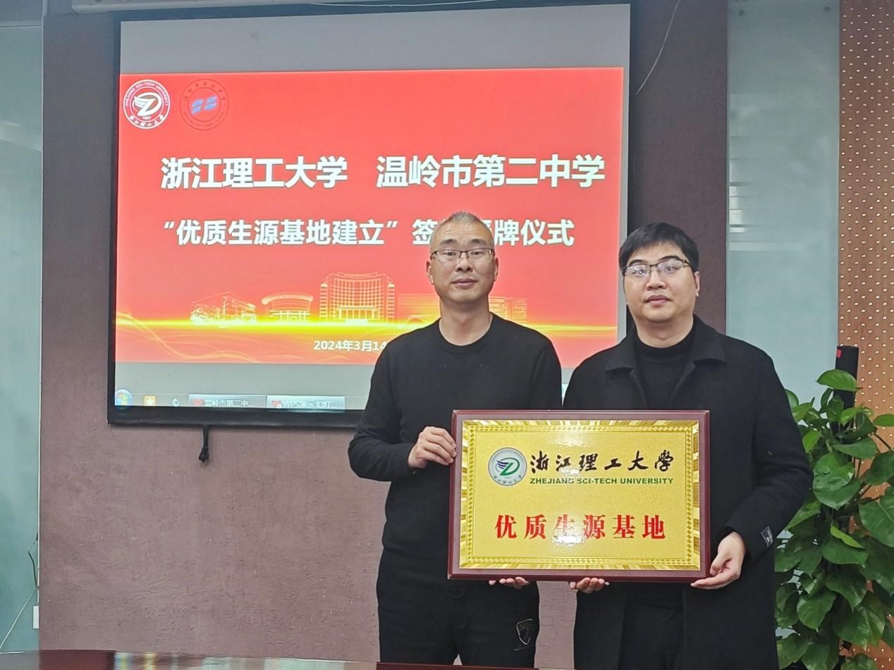 3月14日下午,无码a片 赴温岭市第二中学开展“优质生源基地”签约揭牌仪式暨“三位一体”招生宣讲。温岭市第二中学副校长陈招才、温岭市第二中学校办主任甘爱根、温岭市第二中学团委书记郭敏剑,校招生与就业指导处副处长黄君,无码a片 党委副书记周照东、材料工程系教工党支部书记林文鑫副教授、招生宣传员王依琳参加招生宣讲。