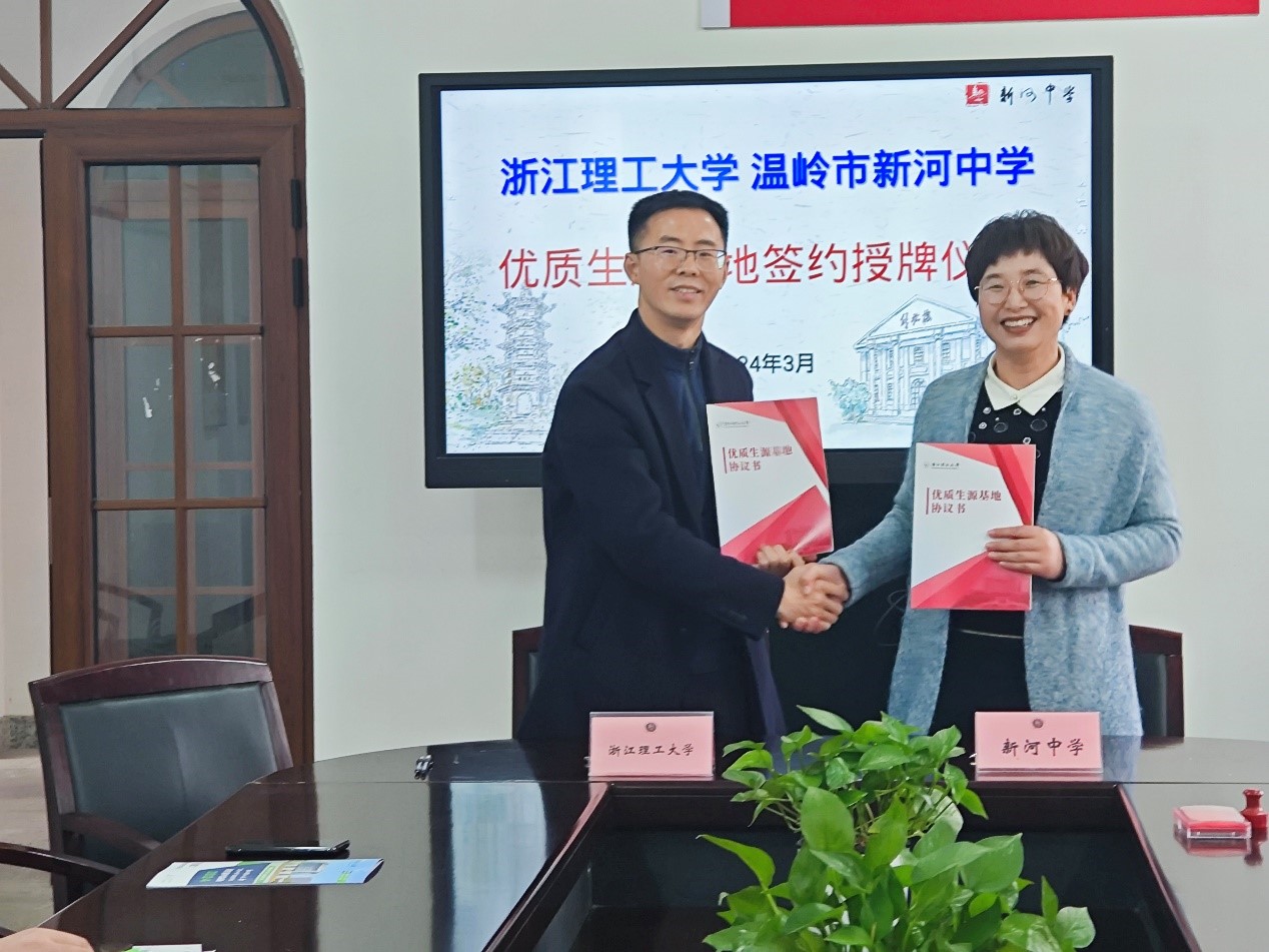 3月14日上午,无码a片 赴温岭市新河中学开展“优质生源基地”签约揭牌仪式暨“三位一体”招生宣讲。新河中学副校长林霞、高三年级部主任陈霞、高三年级部副主王静刚、升学考试中心主任陶正,校招生与就业指导处副处长黄君,无码a片 党委副书记周照东、材料工程系教工党支部书记林文鑫副教授、招生宣传员王依琳参加招生宣讲。