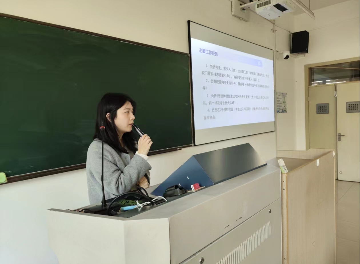 学院团委书记张姗姗老师对工作内容进行了提醒,工作人员要熟悉各项工作内容和流程,确保在工作中能够迅速、准确地响应考生和家长的需求。