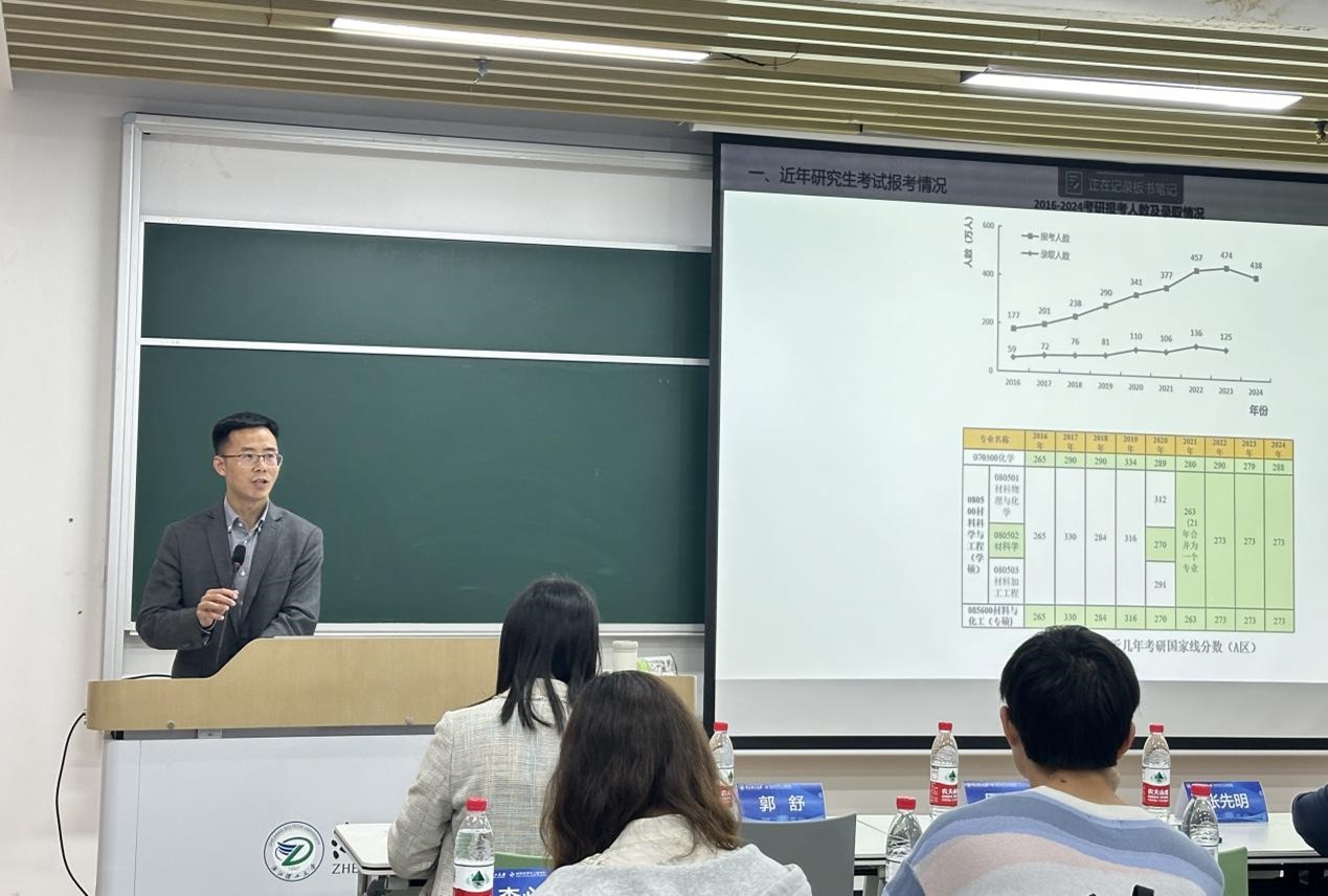 副书记周照东结合近年来全国研究生报考人数、招生规模、报录比的整体情况进行了对比,并就学院近五年来的研究生报考情况、考试情况、录取情况进行了综合介绍,对学生平均学分绩点与录取院校的关系及调剂行情进行了大数据分析,让同学们明白结合自身实际选择合适目标的重要性,希望同学们充分了解招生政策,掌握报考流程,科学选择院校此外,他还深入剖析了考研对个人成长、学院学校和国家发展的积极作用,鼓励同学们坚定信心,不畏艰难,实现考研目标。