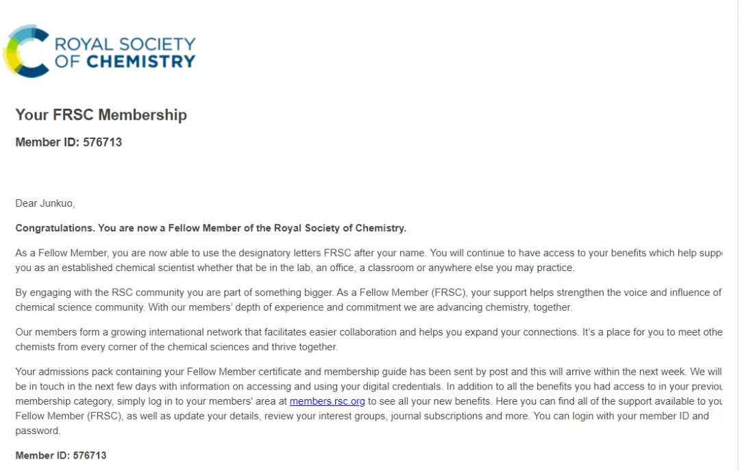 高俊阔教授收到来自英国皇家化学学会(Royal Society of Chemistry, RSC)发来的贺信,当选为英国皇家化学学会会士(Fellow of the Royal Society of Chemistry, FRSC)。