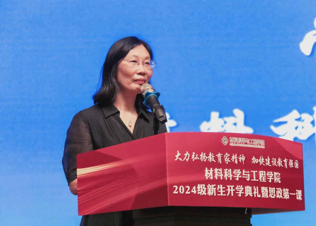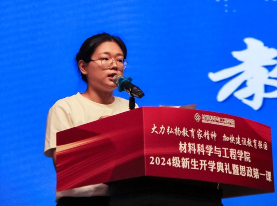 教师代表、班主任代表曹聪发言。她向在座的2024级材料新生们表示热烈的欢迎和衷心的祝福,希望大家能做到四颗心:第一颗是有志者事竟成的恒心,在这个浮躁纷扰的世界里,要有拒绝躺平的觉悟,培养敢赢,敢表现,敢于争先的精神;第二颗是勇于尝试不怕失败的信心,每一次尝试都是一次成长的机会,要找到自己能力所长的舒适区,在那里发光发热,有所收获;第三颗是关注自我成长的耐心,要从繁杂的信息中锻炼个人思辨能力,学会调节个人情绪和人际关系,找寻到真正的自我;最后是能够拥有一份感恩的爱心,在未来的四年里,有在座的良师益友的陪伴,你们定能创造独属于你们的无限精彩。