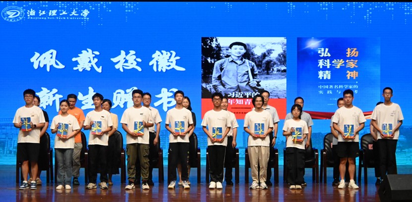佩戴校徽仪式环节。台上的学院领导、老师亲手为本科生、硕士生和博士生新生代表佩戴了校徽并赠送《习近平的七年知青岁月》《弘扬科学家精神》。戴上校徽意味着他们正式成为浙理材料人,希望书籍能成为他们最坚实的帆,并为他们的大学生活以及新的人生阶段开启一扇智慧之门。