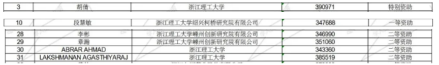 近日,浙江省博士后公示了2024年度浙江省博士后科研项目择优资助人选,我院博士后胡倩获特别资助,段惠敏获一等资助,李彬、章瀚、ABRAR AHMAD、LAKSHMANAN AGASTHIYARAY获二等资助。