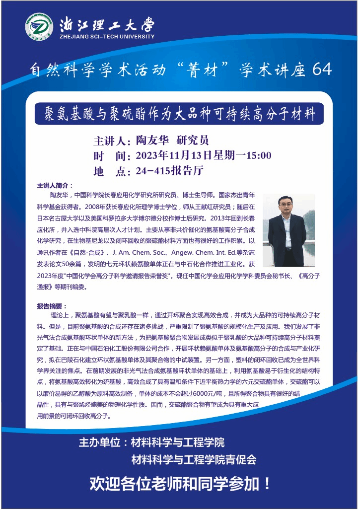 学术讲座【64】:聚氨基酸与聚硫酯作为大品种可持续高分子材料