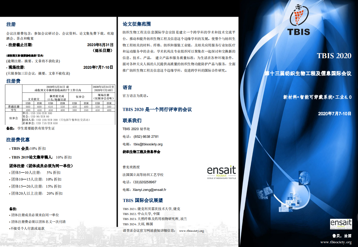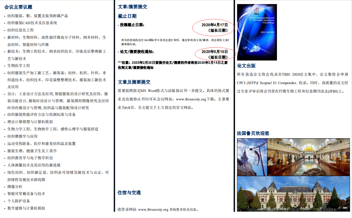 学术会议 当前位置: 无码a片 > 学术会议 > 正文 TBIS 2020第十三届纺织生物工程及信息国际会议-补充通知 作者:时间:2020-03-17浏览次数: 各位老师: 会议论文/摘要截止日期由2月28日延长至4月17日。
