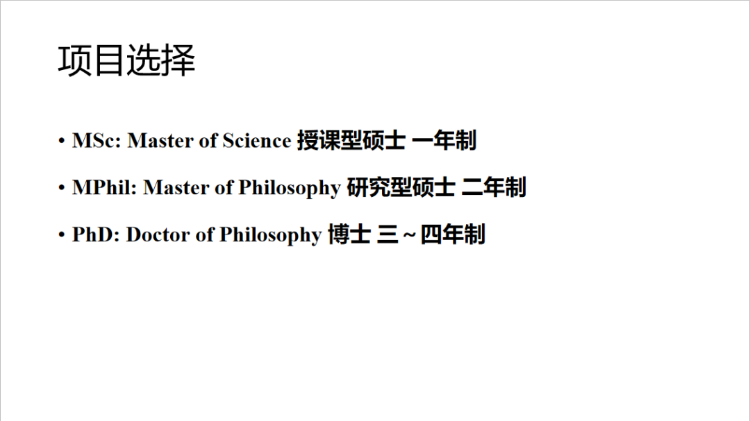 与国内不同的是,英国的硕士学位主要分为两大类,授课型硕士和研究型硕士。顾名思义,授课型硕士主要是课堂教学,当然也不缺乏实践,总体学时是一年制;而研究型硕士更注重课题研究,需要两年的时间,同时也是作为以后博士学位求学的铺垫。而国内本科毕业的学生也是可以直接申请英国博士学位的,时长在3-4年不等。
