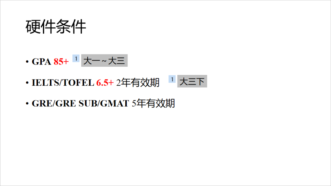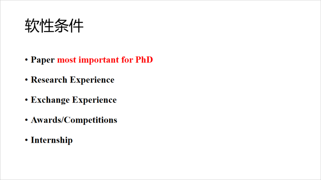 主要是这五点。对于博士申请,最重要的是科研成果,也就是发表的论文。与之对应的,是你的科研经历,这一点对于授课型硕士的申请是加分项,但对于研究型硕士的申请是至关重要的。另外还有交换经历,像学校的长期短期交流项目以及夏令营等活动。同样的,所有的荣誉、奖励和竞赛经历都能提高你的整体竞争力。如果,学有余力的话,实习经历也可以丰富你的简历,这一项对于社科类和商科学生的申请是必备的。但对于我们工科申请,还是科研经历更为重要。