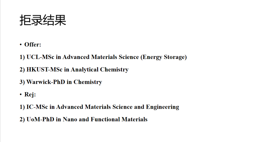 这是到目前为止我的offer拒录情况。我申请的地区主要是英国,申请的项目比较混杂,有硕士也有博士,专业也有化学和材料。