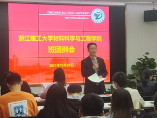 周照东老师注重从安全稳定工作方面部署了具体工作,安全稳定工作是学校年度高分报表工作之一,学校和学院正在稳步推进,要落实网格化管理举措,强化班团责任担当,推进工作落实落细:实验室安全问题方面,是全方位的立体网络问题,关系到实验室导师、同学、自己的药品安全使用、仪器安全使用、用电安全等方面,希望各位同学在实验过程中互相监督提醒,规范实验操作,学院也将通过“平安材俊”活动加大安全宣传力度。校园交通安全方面,基于平安校园复核工作,学校保卫处在校园道路上划分了非机动车停车位,要求同学们按照要求规范停车,确保学院外部环境秩序优良。疫情防控方面,现在仍有爆发病例,不可控因素较多,疫情防控任重道远,同学们要遵守疫情防控相关规定,坚持每天健康打卡,非必要不出省,如有特殊情况,需要进行提前审批。